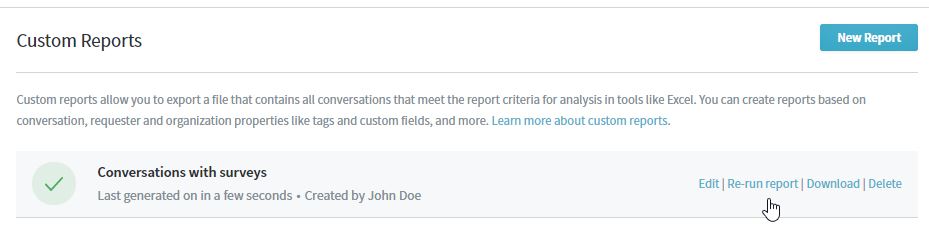 NOTE: The report will be downloaded as a CSV file. You may peruse it or create graphical reports using MS Excel or Google Sheets. If you want to retrieve the specific conversation associated with the survey for reviewing purposes, you can use the Case ID by typing the syntax ID:Case ID in the search bar on Kayako. For example, if the case ID is 84, you can typeID:84and it will pull up the corresponding conversation with that ID.