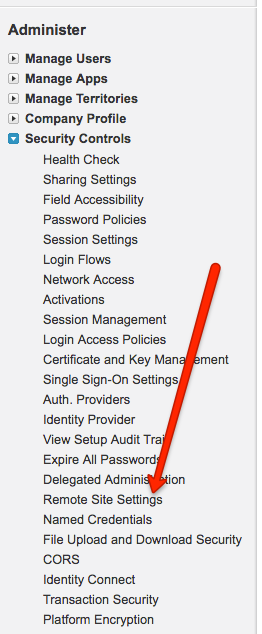 - From the sidebar, under the 'Administer' heading, open Security Controls and click Remote Site Settings.