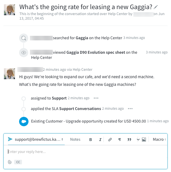 For example, you can see here how a new opportunity will appear in the relevant conversation, so your team won't miss a thing: