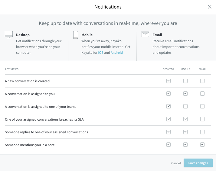 For mobile notifications, you'll have to have one of the Kayako mobile apps installed on your device. When you're away, Kayako notifies your mobile instead.