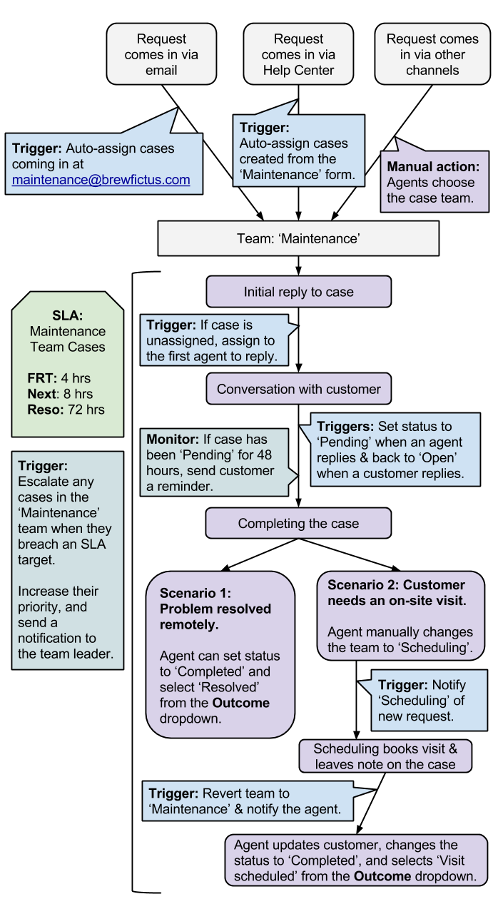 Let's look at an example. If you've spent much time in our Help Center, you may have heard of Brewfictus, our favorite, fictional coffee equipment supplier. The Brewfictus support organization is broken into two main teams. The customer service team is their first line for incoming support requests, and the maintenance team specializes in more technical repair requests. We're going to look at how Brewfictus used workflow automation to streamline their maintenance team's process.