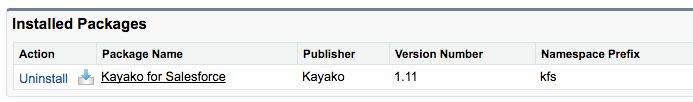 The installation will take a few moments. When it's done, you'll receive a confirmation email, and you'll be redirected to the 'Installed Packages' of your Salesforce account. You should see 'Kayako for Salesforce' on the list: